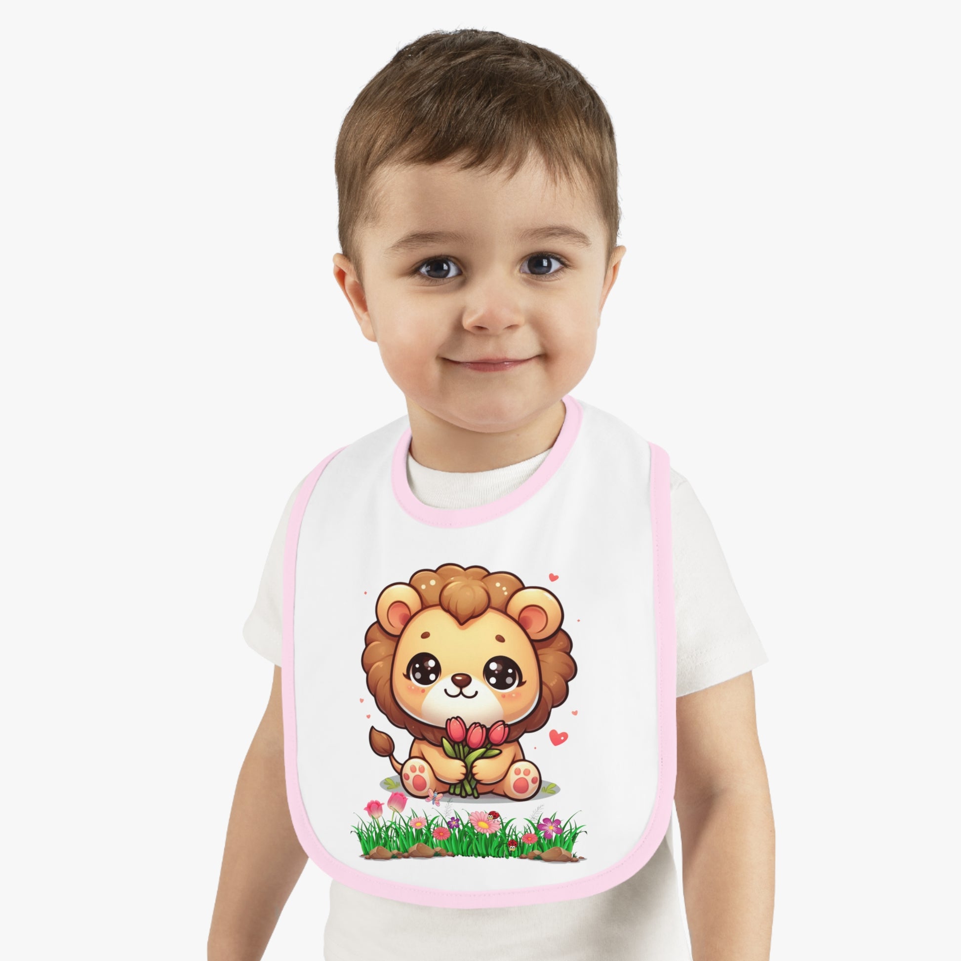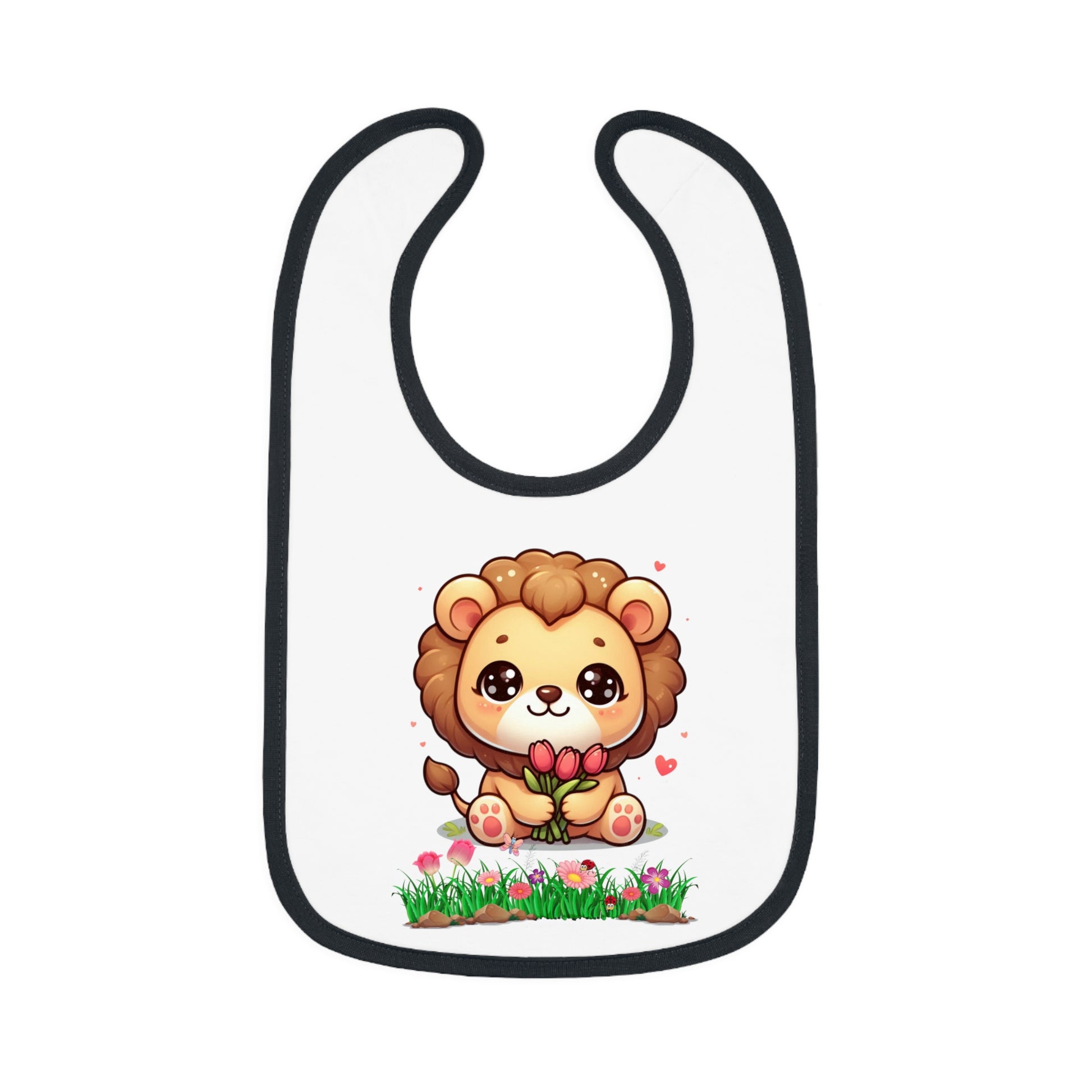 Baby Bib — Cute Lion Holding Flowers, Contrast Trim Infant Feeding Bib