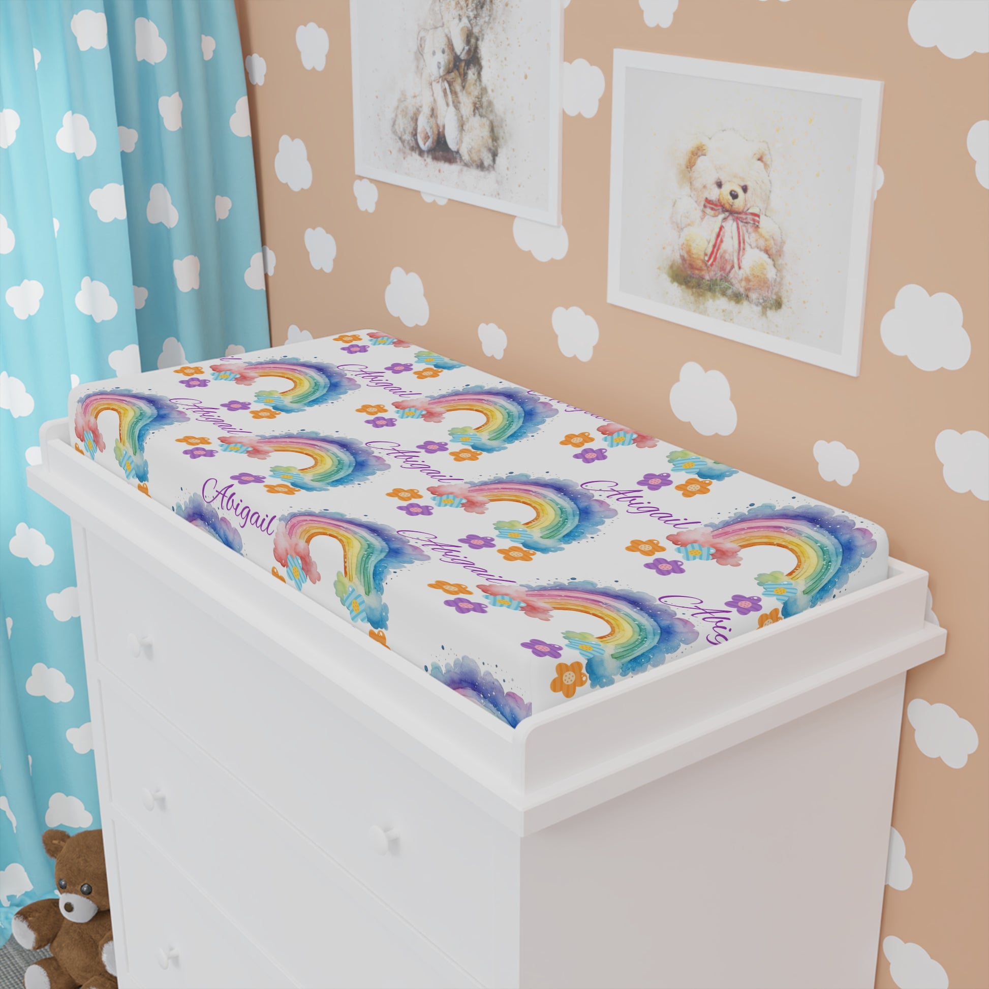 Soft watercolors and tiny blossoms wrap this changing pad cover in a gentle, joyful hush. Rainbows in blush, lavender, and mint arc across a crisp white background, while scattered orange and purple flowers add a playful pop. The jersey-knit fabric stretches smoothly over a standard 32" x 16.5" pad, hugging corners with a reinforced elastic lining so it stays put through quick diaper changes and sleepy, fussy moments. Lightweight and breathable, the cover keeps the surface comfortable for newborn skin and brightens any nursery with an easy, handcrafted look. Use it during late-night feeds, afternoon diaper swaps, or when you want the changing area to feel like a calm, colorful corner of the room.