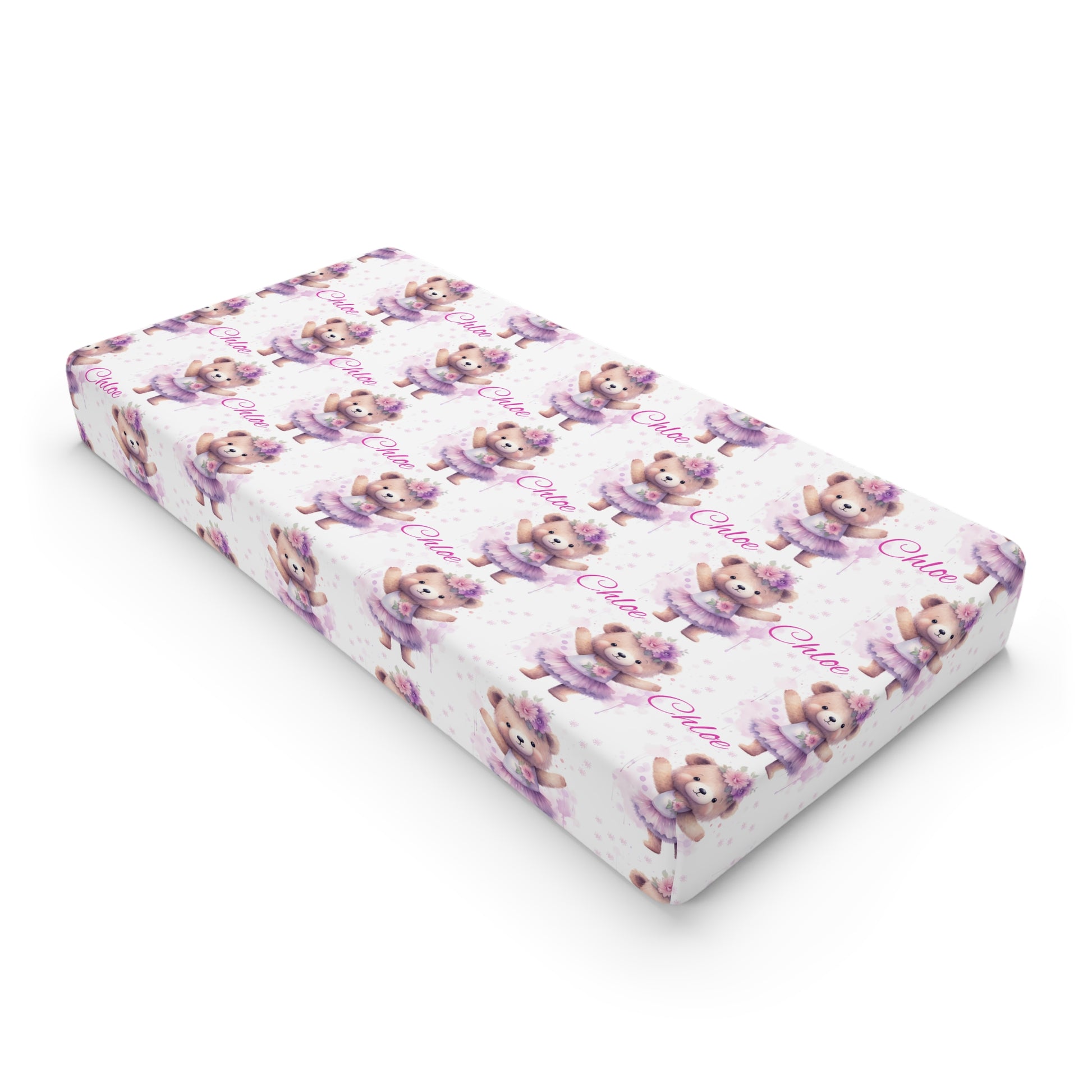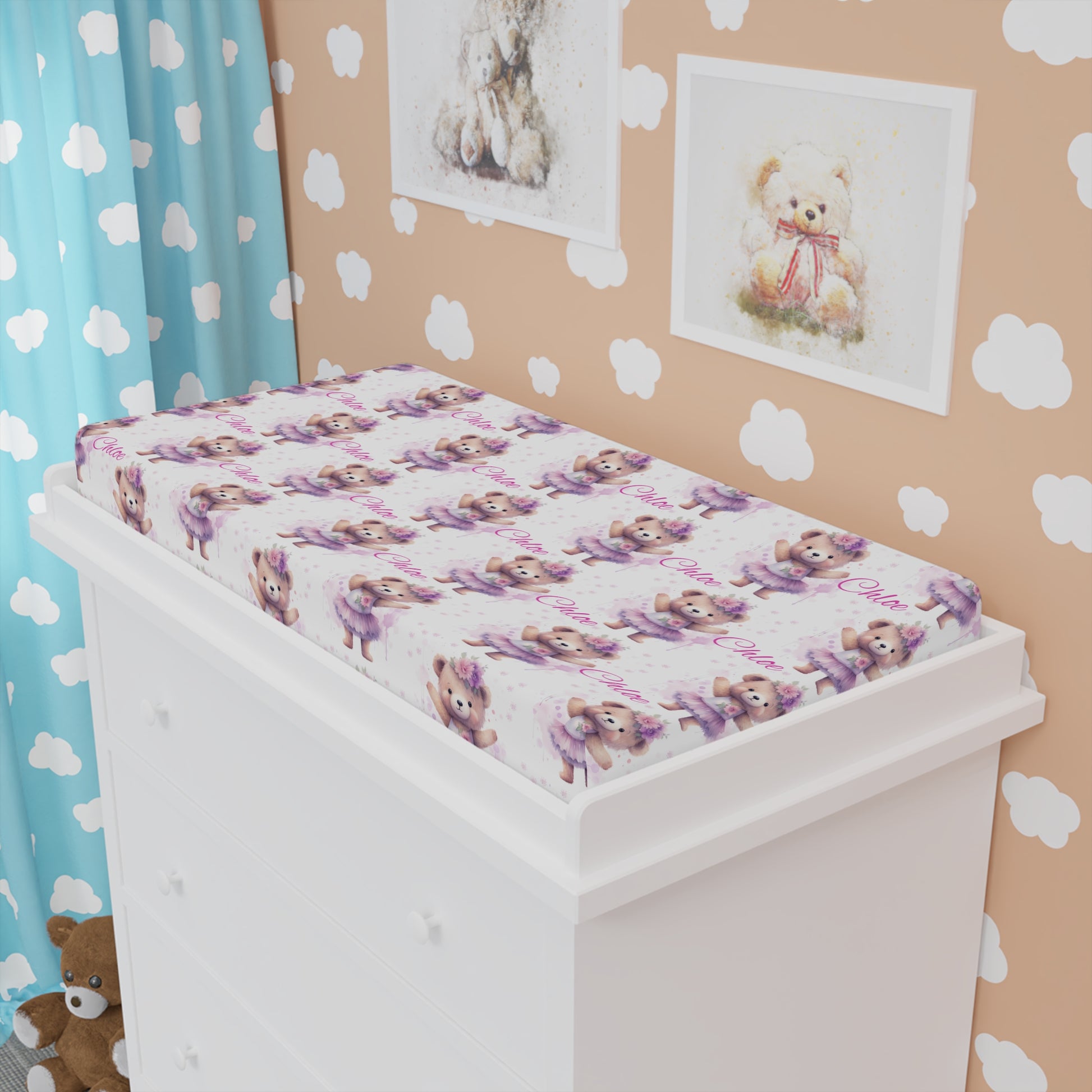 Changing Pad Cover — Cute Purple Teddy Bear Pattern (Personalized Name Option)