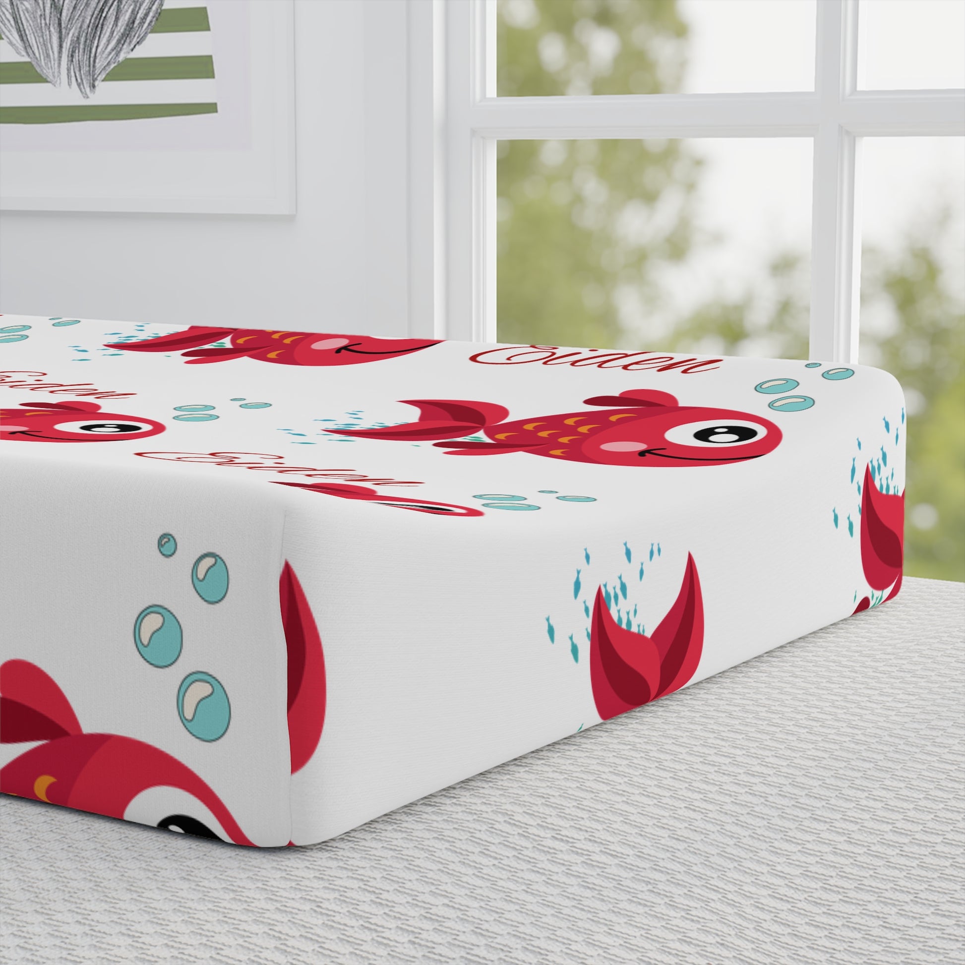 Soft, breathable changing pad cover with a playful red fish pattern that brings cheerful energy to diaper changes. The jersey-knit fabric feels gentle against baby’s skin while the reinforced elastic edge keeps the cover snug on a standard 32" x 16.5" changing pad. Bright, long-lasting colors and crisp printing make the little fish pop against a clean white background. Lightweight and durable, it washes easily and lays smooth for quick, comfortable changes during busy days and sleepy nights. Ideal for new parents who want a practical cover that still feels fun and personal in the nursery.