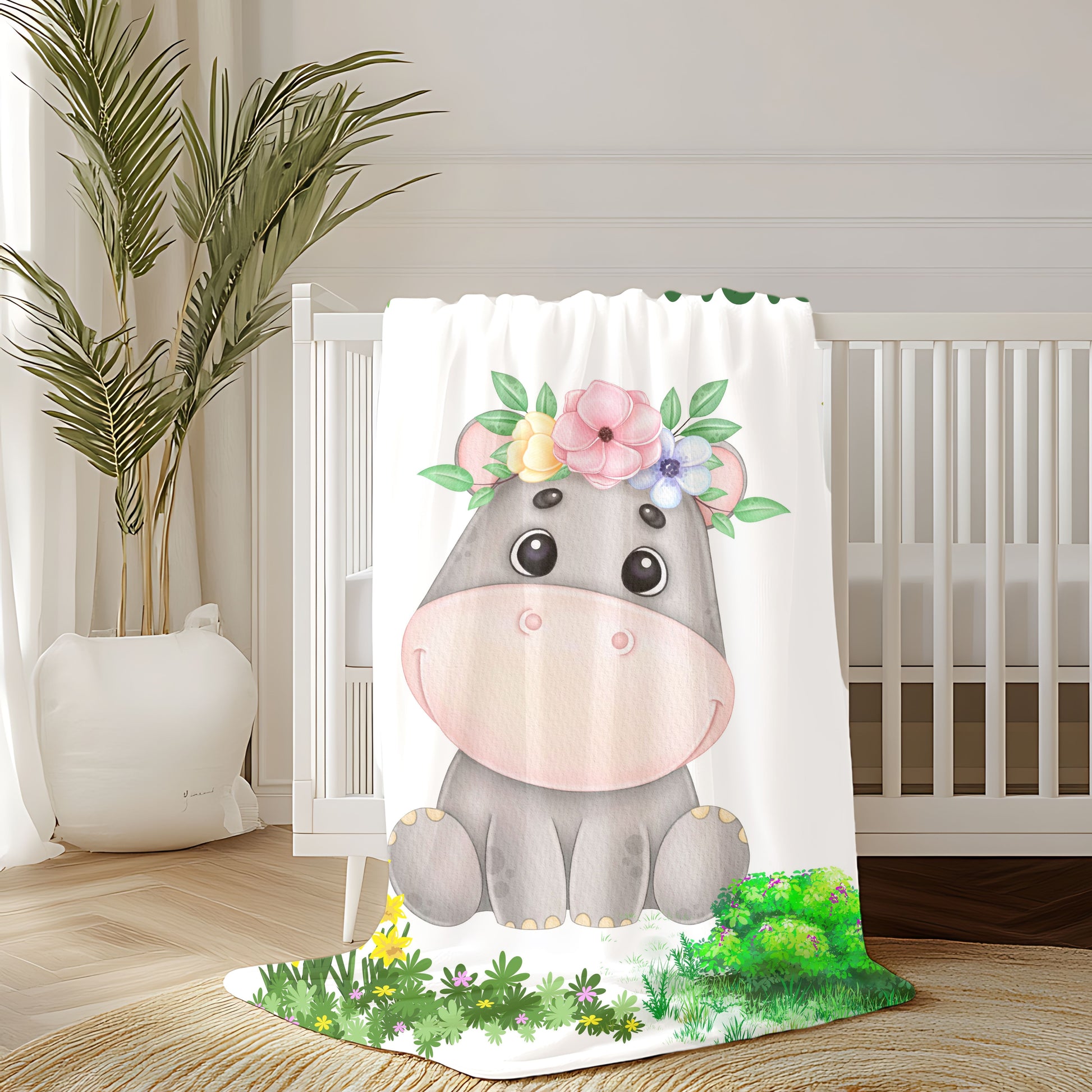 Cozy Velveteen Plush Blanket with Adorable Floral Hippo Design – Perfect for Baby Showers, Gifts, Home Decor, Nursery, Child's Room