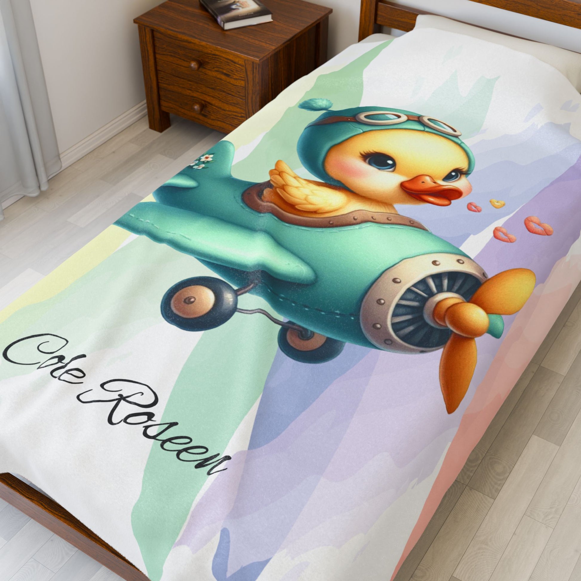 Cozy Velveteen Plush Blanket with Cute Duckling Airplane Design, Personalized Baby Gift, Nursery Decor, Kids Blanket, Baby Shower Present