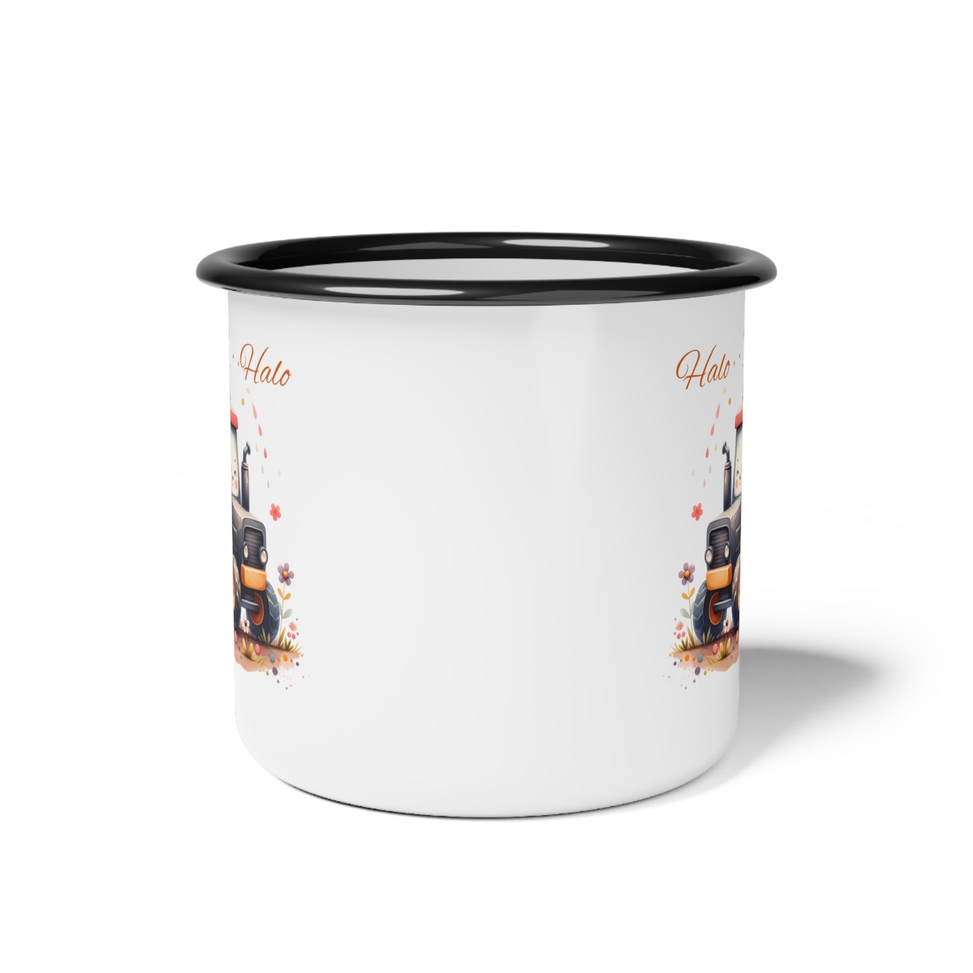 Cute Farm Tractor Enamel Camp Cup — Rustic Camping Mug with Smiling Tractor Design