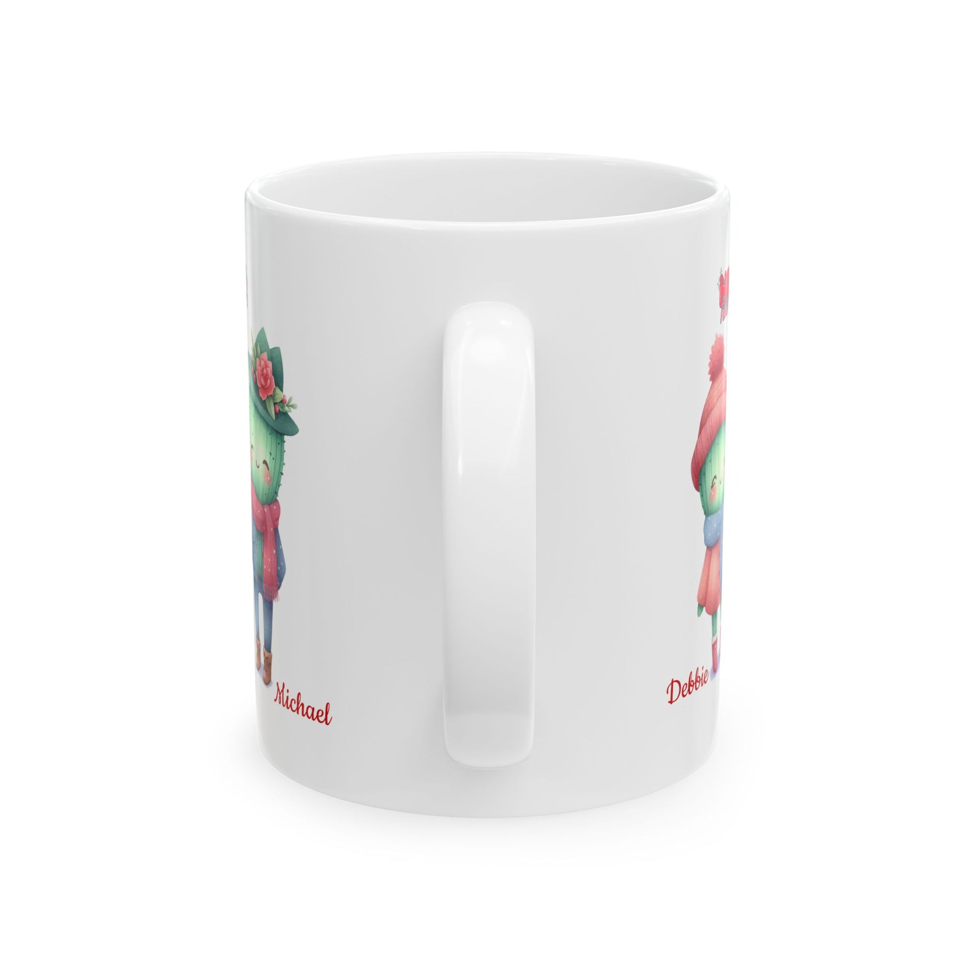 A bright, glossy ceramic mug that brings a playful, cozy vibe to everyday sips. The artwork wraps the white surface with two whimsical characters in winter hats and scarves, each paired with a tiny handwritten name beneath—small, heartwarming details that make mornings feel personal. Lightweight yet sturdy, the mug’s vivid print holds up through daily use and looks cheerful on a kitchen shelf or office desk. Warm tea, cocoa, or coffee tastes softer when held in a smooth C-handle; the shiny finish catches light and shows off the colors. This is the kind of mug you reach for when you want a little comfort and a smile with your drink.