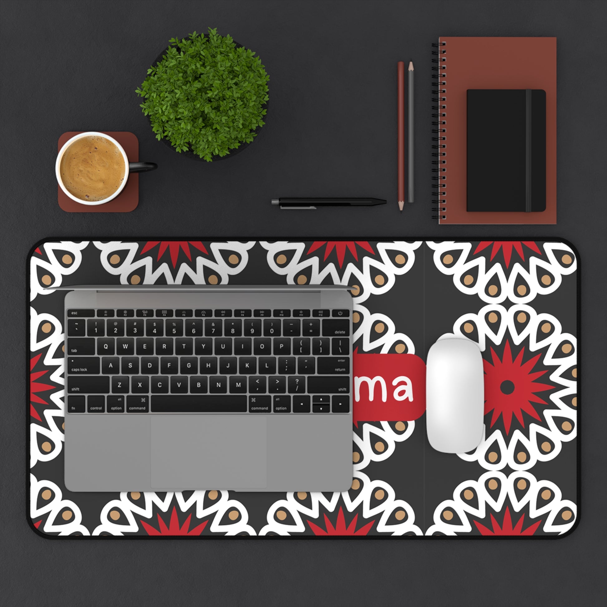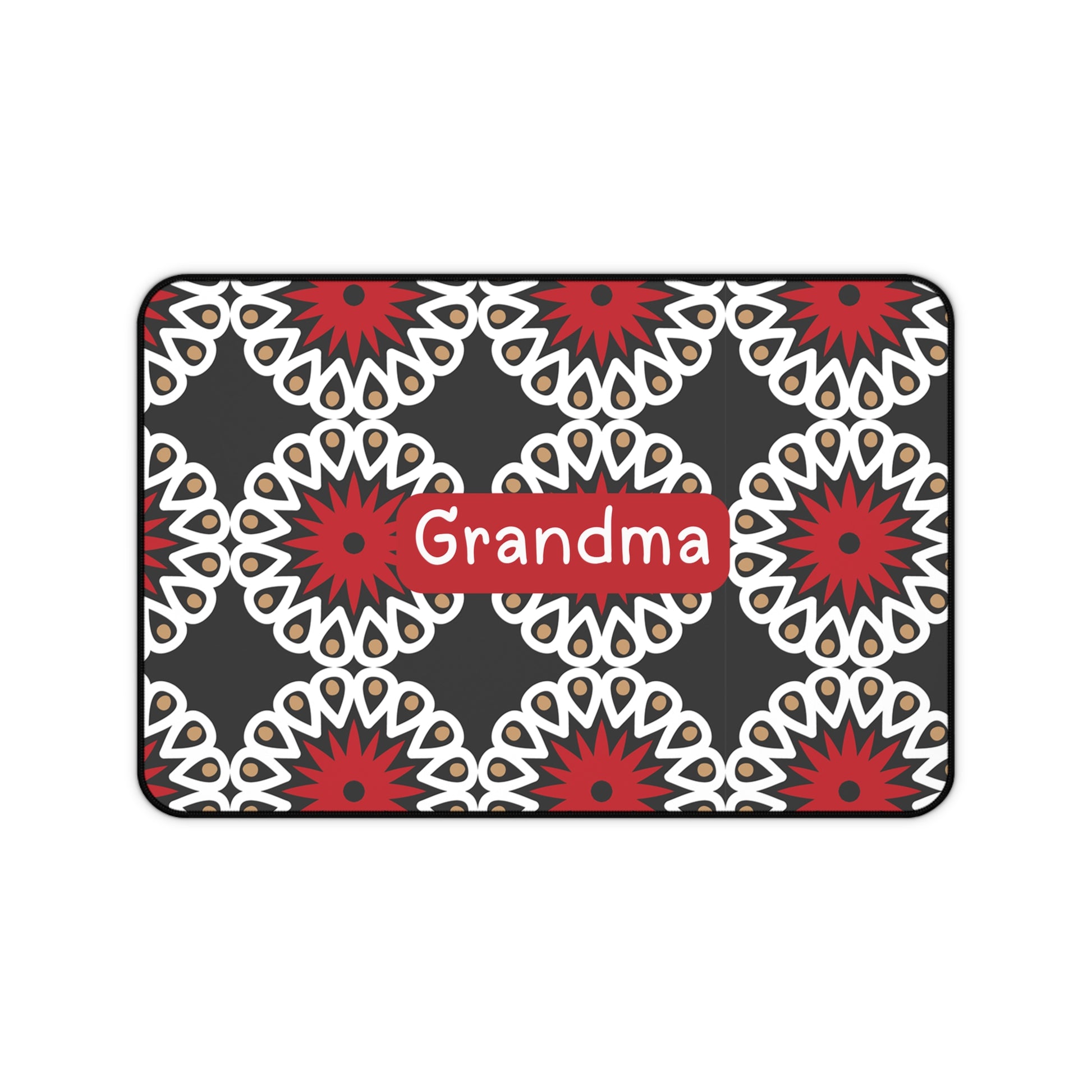 A cozy, colorful neoprene desk mat that brings warmth and personality to a grandma’s workspace. The rich red and charcoal pattern frames a friendly nameplate-style center, turning an ordinary desk into a welcoming spot for letter writing, crafting, or morning coffee and a crossword. The soft-but-durable surface cushions wrists and tools, while the textured, anti-slip backing keeps the mat steady during typing or crafting sessions. Hemmed edges hold up to daily use and the vibrant printing keeps the pattern bright over time. Available in three sizes to suit small desks, craft tables, or larger workstations.