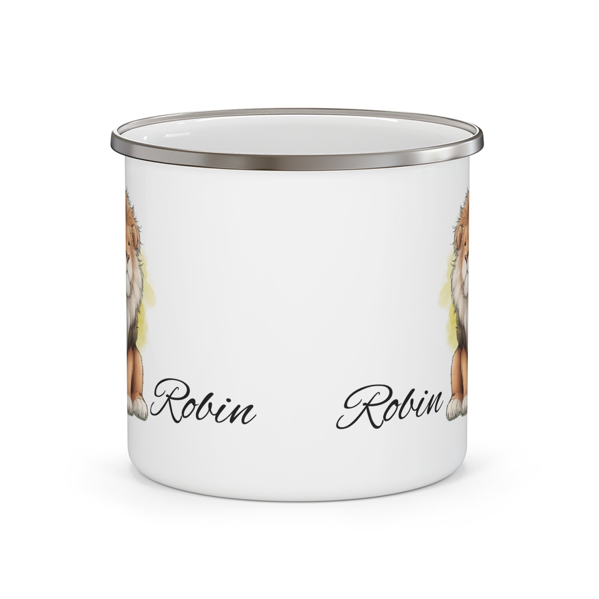 Lion Name Enamel Camping Mug — Personalized "Robin" Rustic Adventure Camper Cup