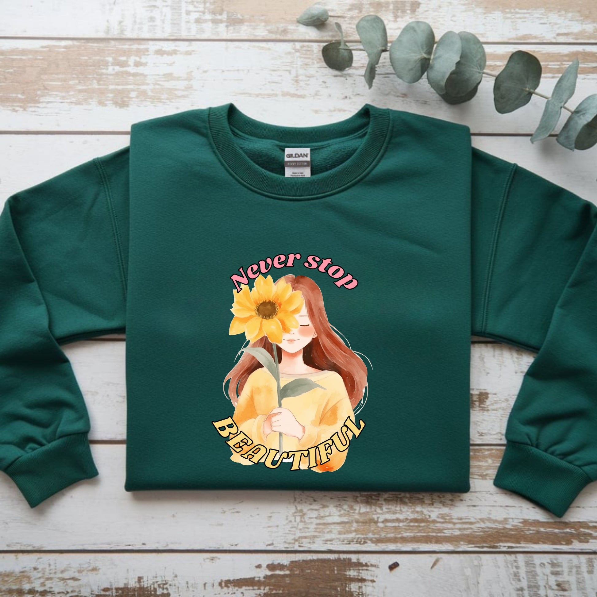 Never Stop Beautiful Sweatshirt, Unisex Crewneck Sweatshirt, Gift for Her, Cozy Apparel, Floral Design Sweatshirt, Positive Vibes Clothing