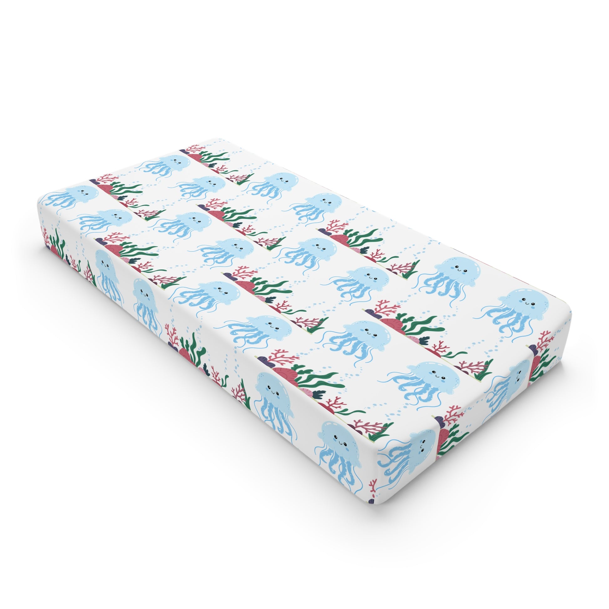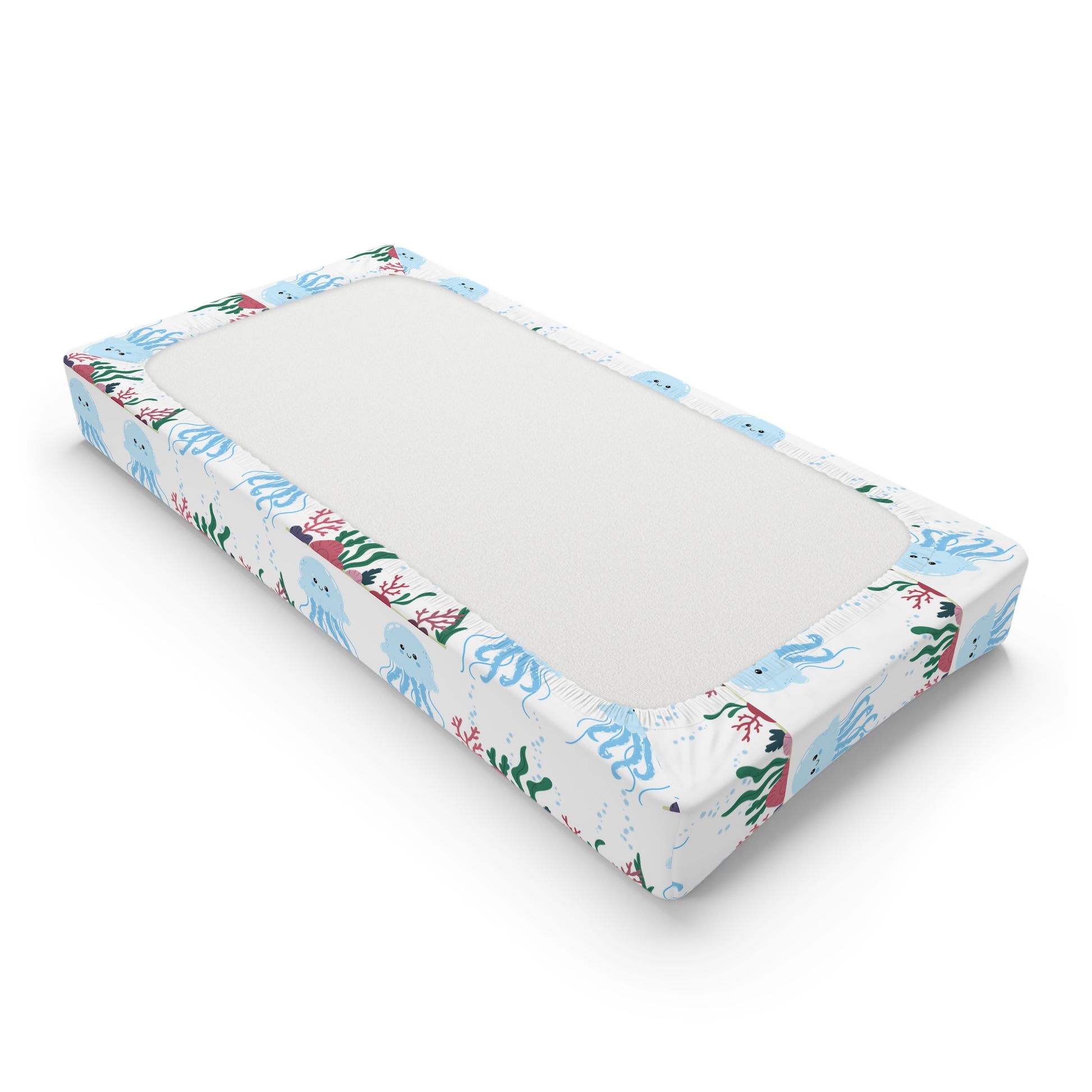 Soft, breathable changing pad cover with a whimsical underwater print — gentle blues, playful octopi, and sprigs of coral drift across a crisp white background. Lightweight and stretchy, the jersey-knit fabric hugs a standard 32" × 16.5" changing pad with a reinforced elastic fitted lining so the cover stays smooth through quick diaper changes and naps. Hand-sewn details and vibrant, fade-resistant printing keep the design bright wash after wash. This cover brings a calm, seaside mood to nursery routines, turning everyday care into a small moment of joy.
