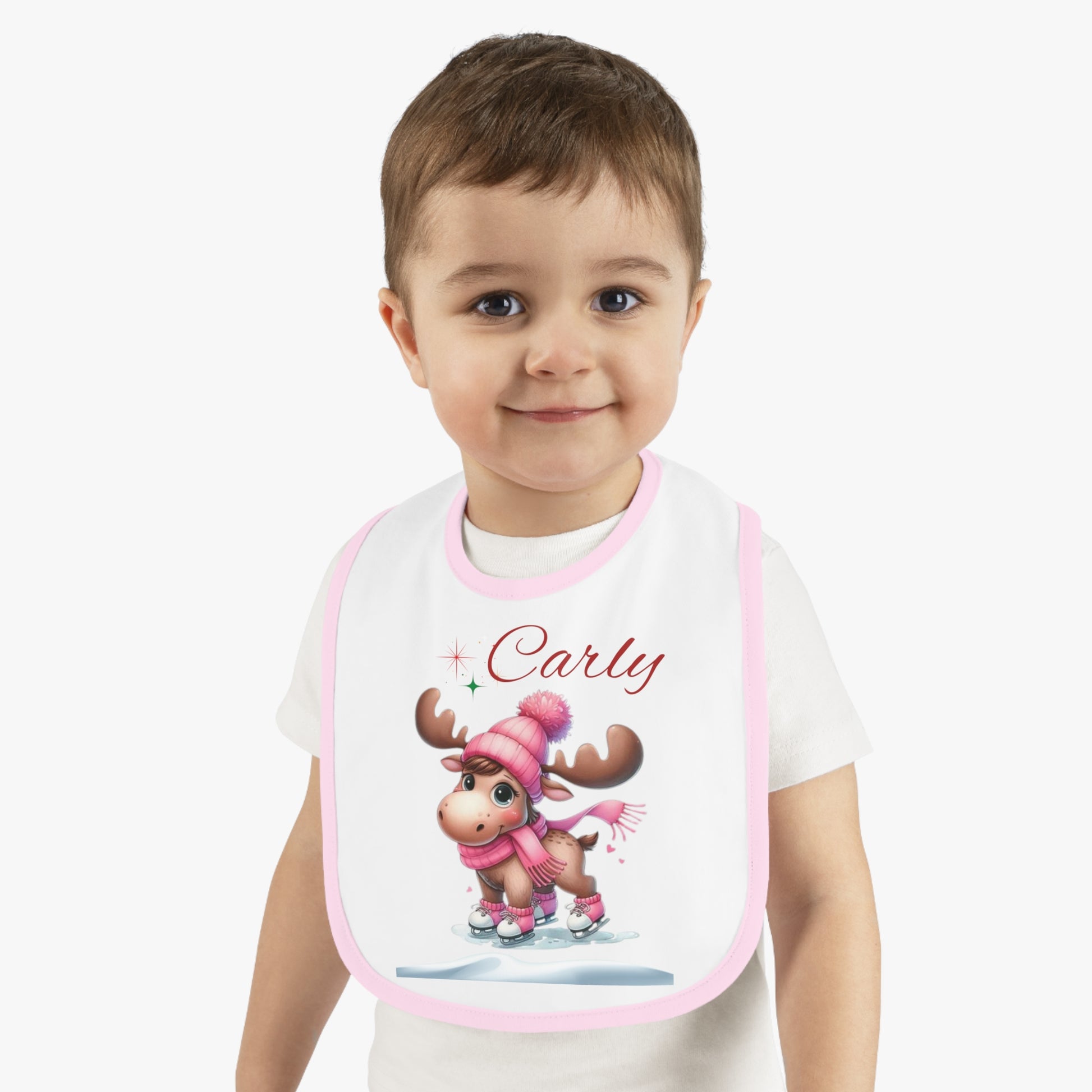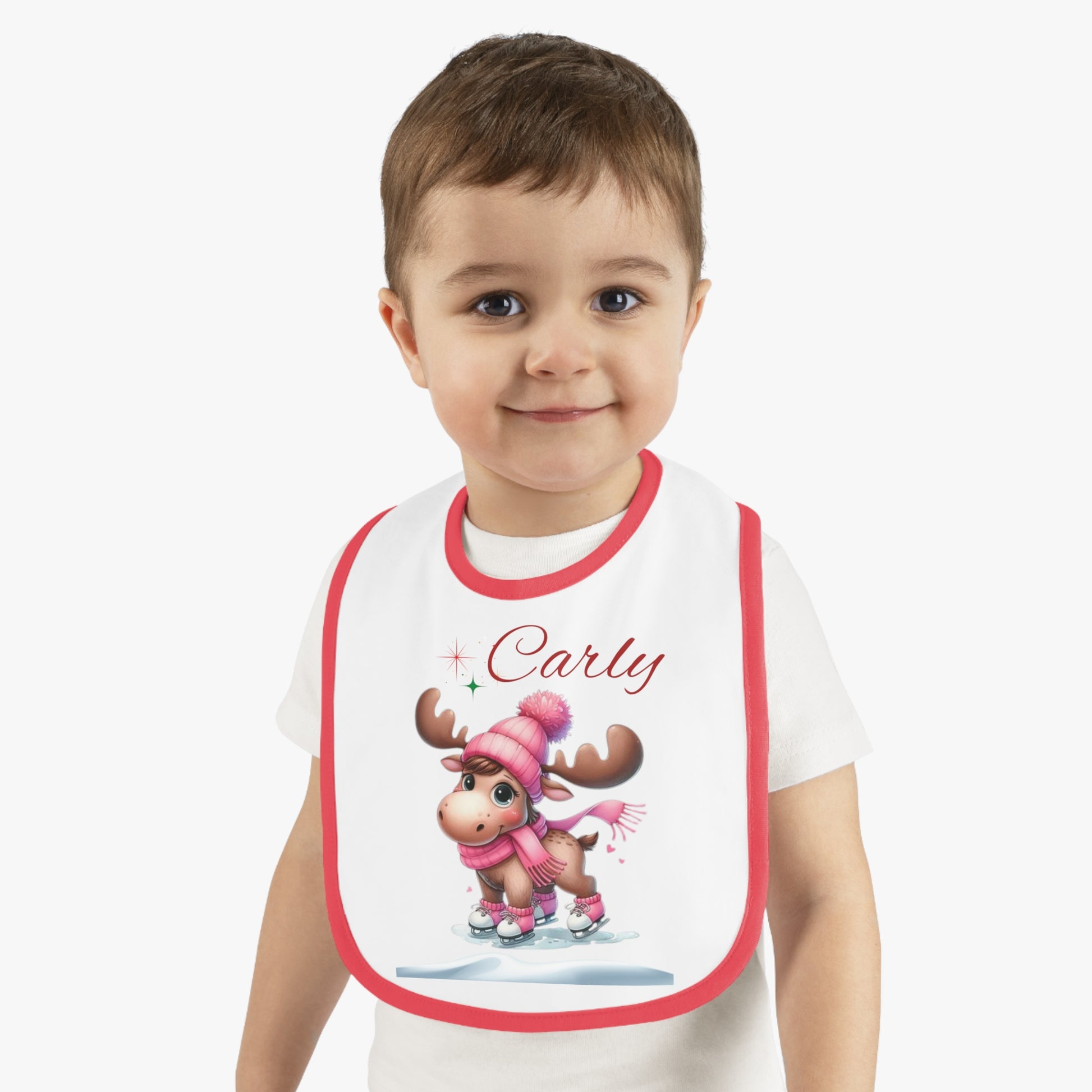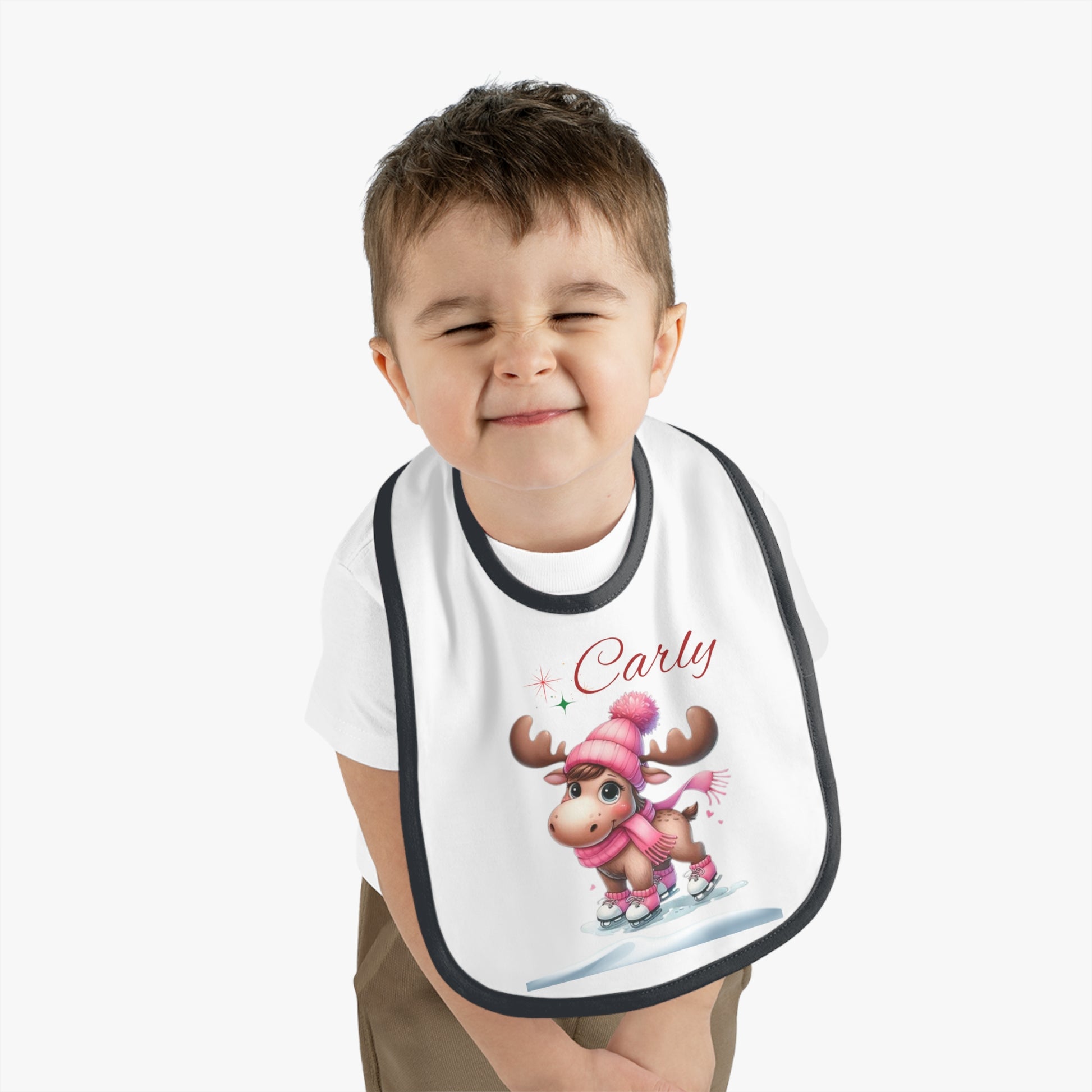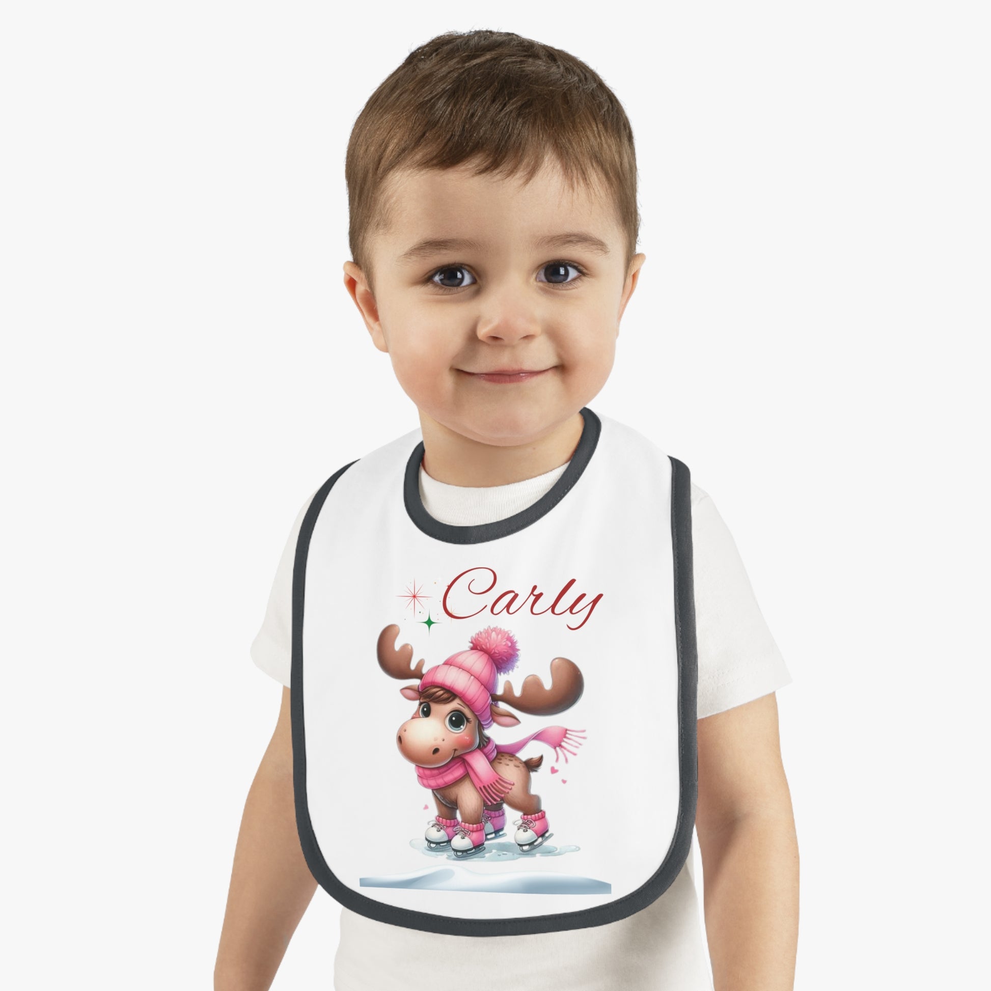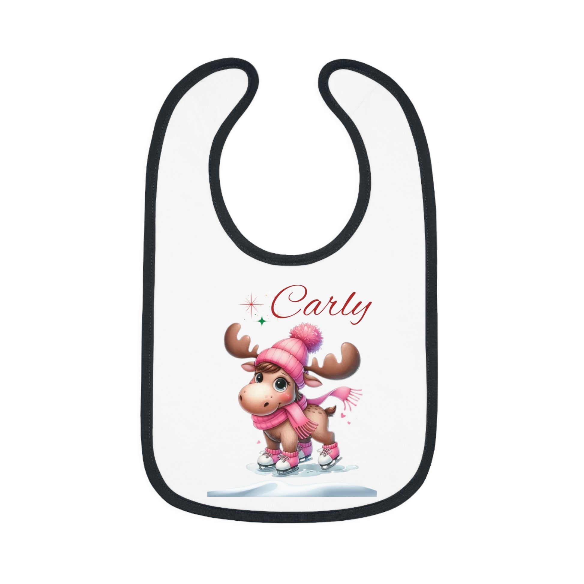 Personalized Baby Bib — Cute Ice Skating Moose with Name (Custom Carly)