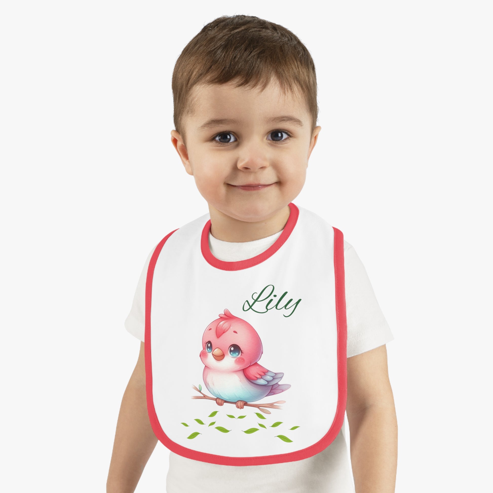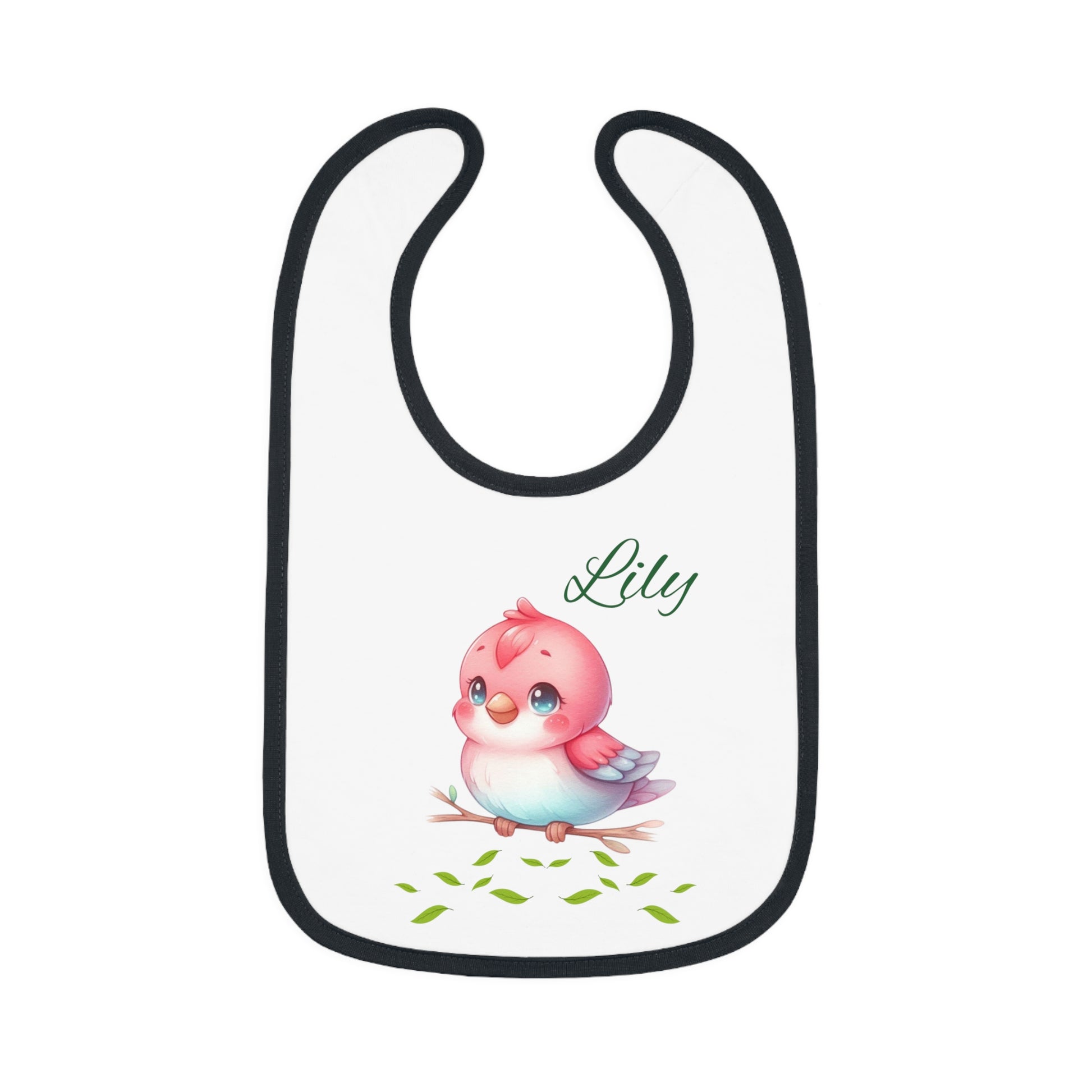 Personalized Baby Bib — Cute Pink Bird with Name (Lily) | Contrast Trim Jersey Bib