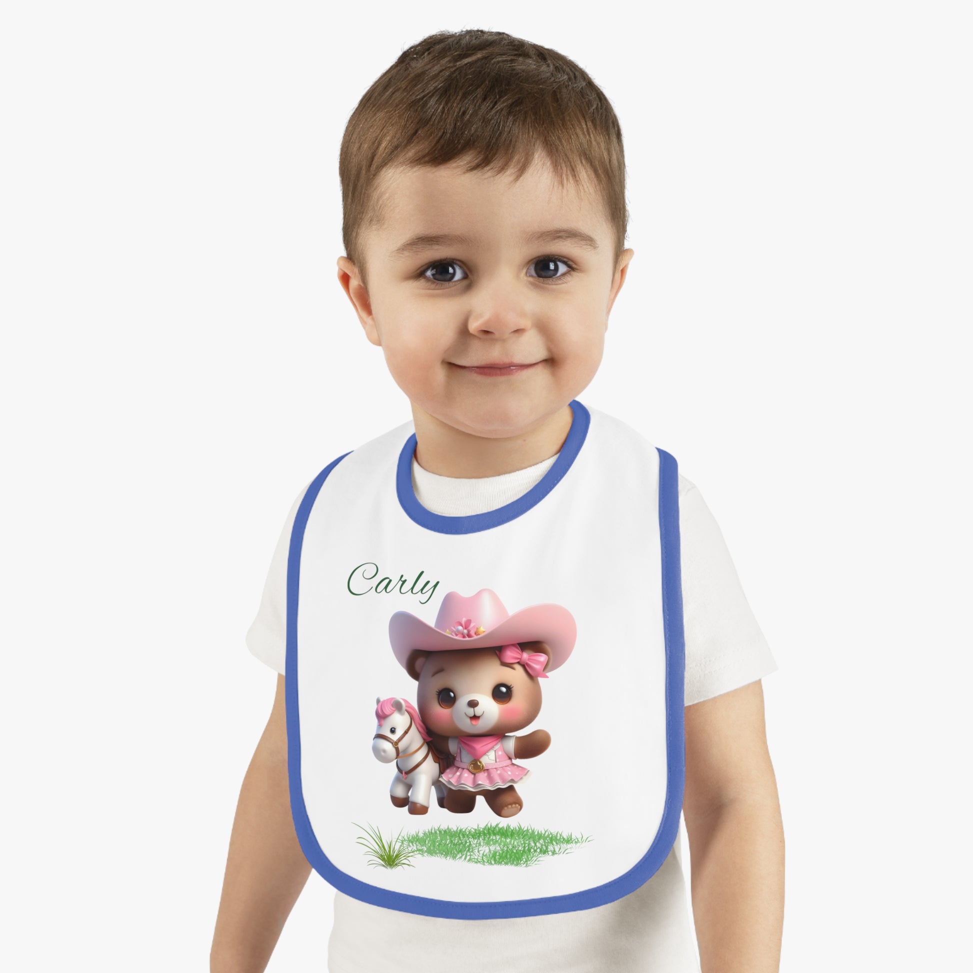 Soft, simple, and sweet — a little bib made to sit gently against baby’s skin while adding a touch of playful charm. The black contrast trim frames a cheerful cowgirl bear and tiny hobby horse, bringing soft pastels and a hint of country whimsy to feeding time. Lightweight but durable, it stays in place with a reinforced Velcro® closure and wipes clean easily after pudding, milk, or pureed carrots. This bib slips on and off fast, so mornings, mealtimes, and messy afternoons stay calm and focused on cuddles instead of cleanup.