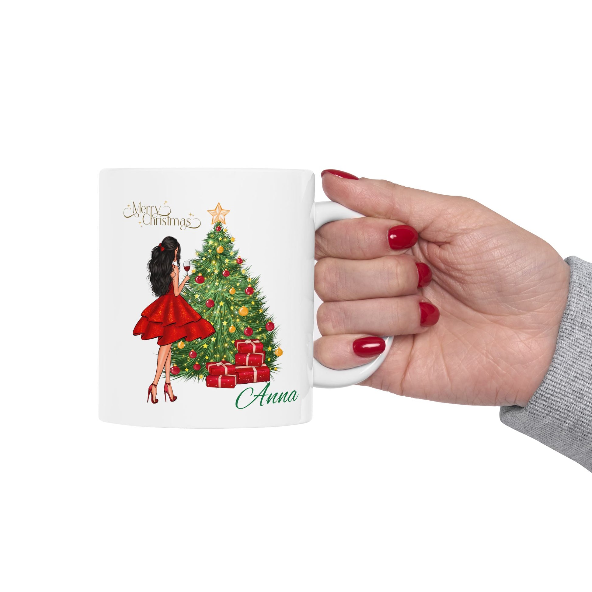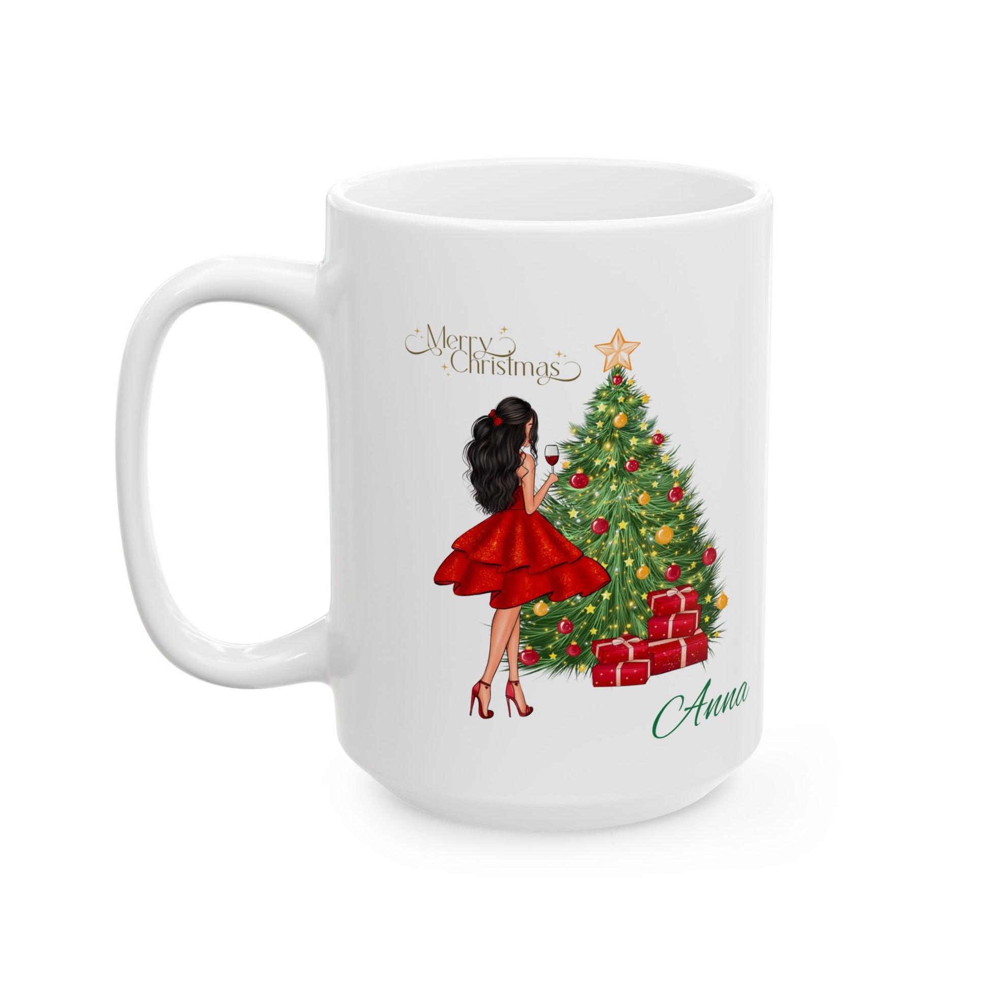 Personalized Christmas Mug – Festive Tree & Girl Illustration (11oz/15oz)