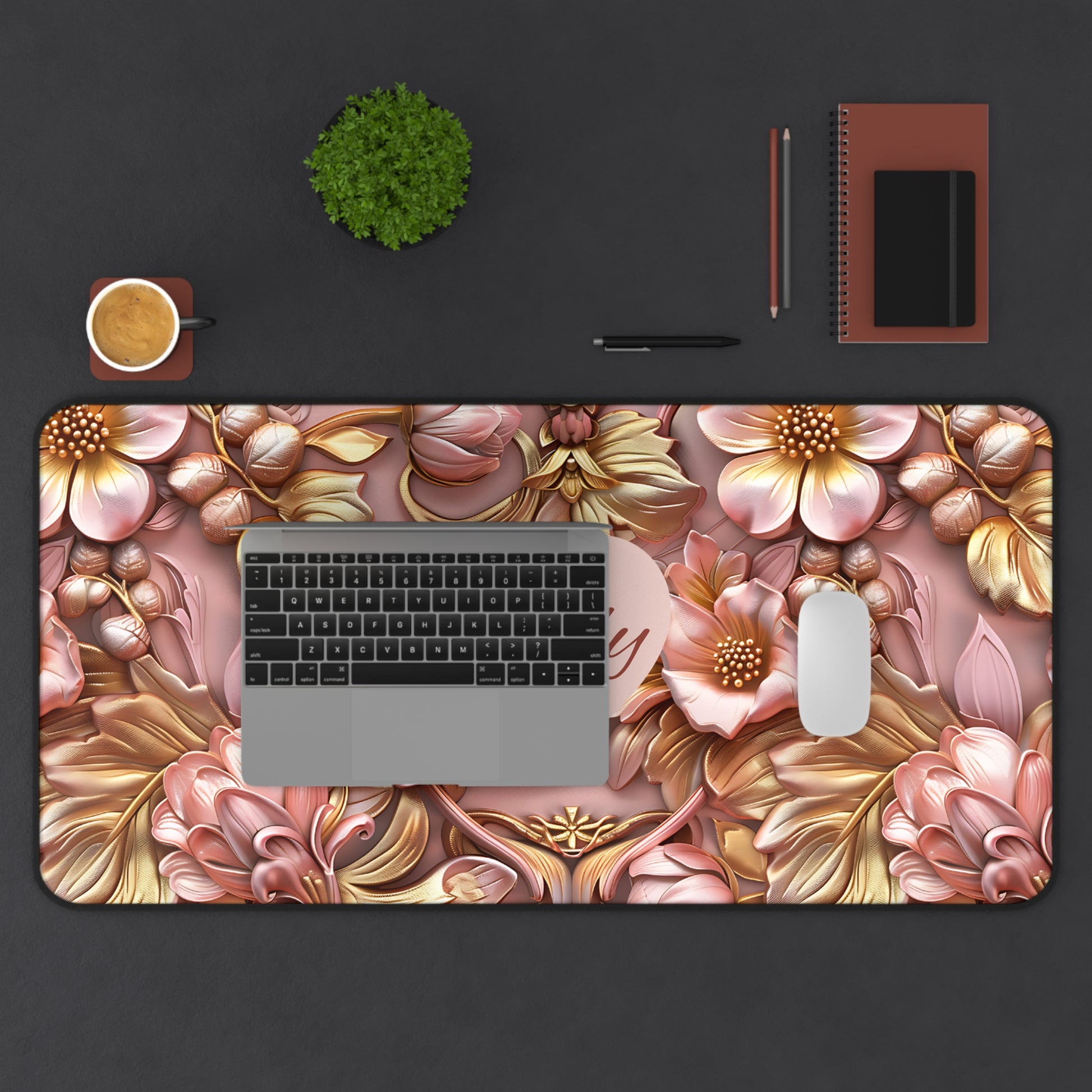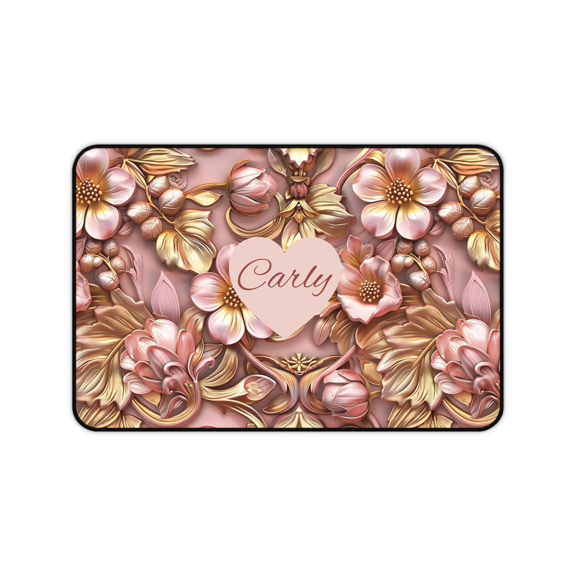 Personalized Floral Desk Mat — Rose Gold Heart Name Desk Pad