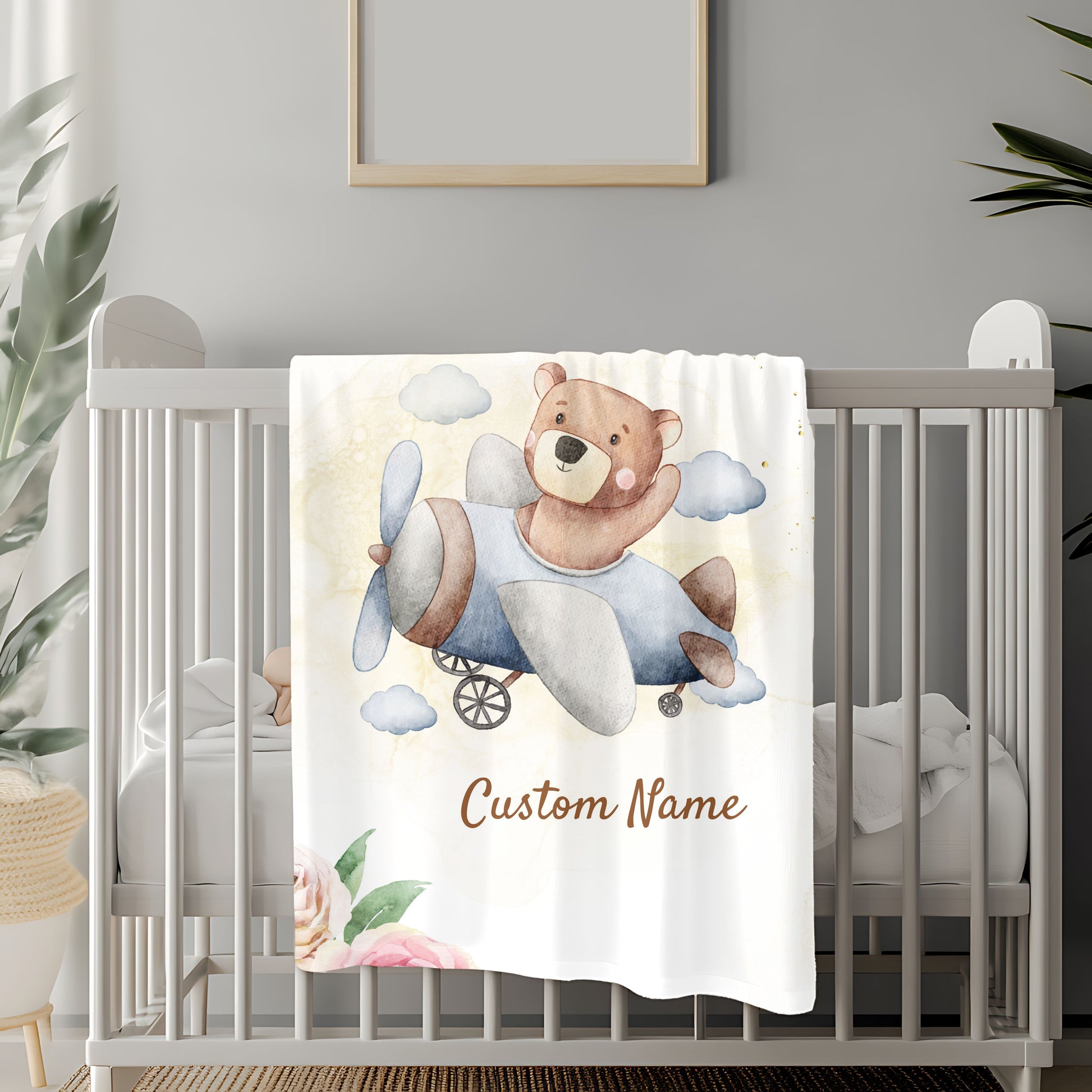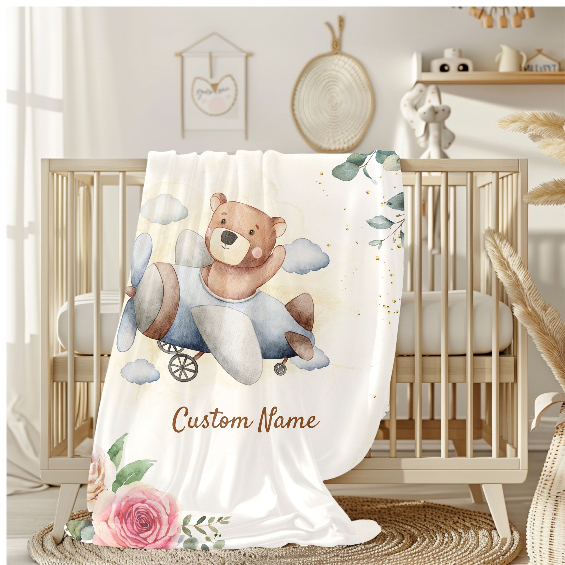 Personalized Velveteen Plush Blanket with Custom Name, Kids Blanket, Nursery Decor, Baby Shower Gift, Floral Bear Design