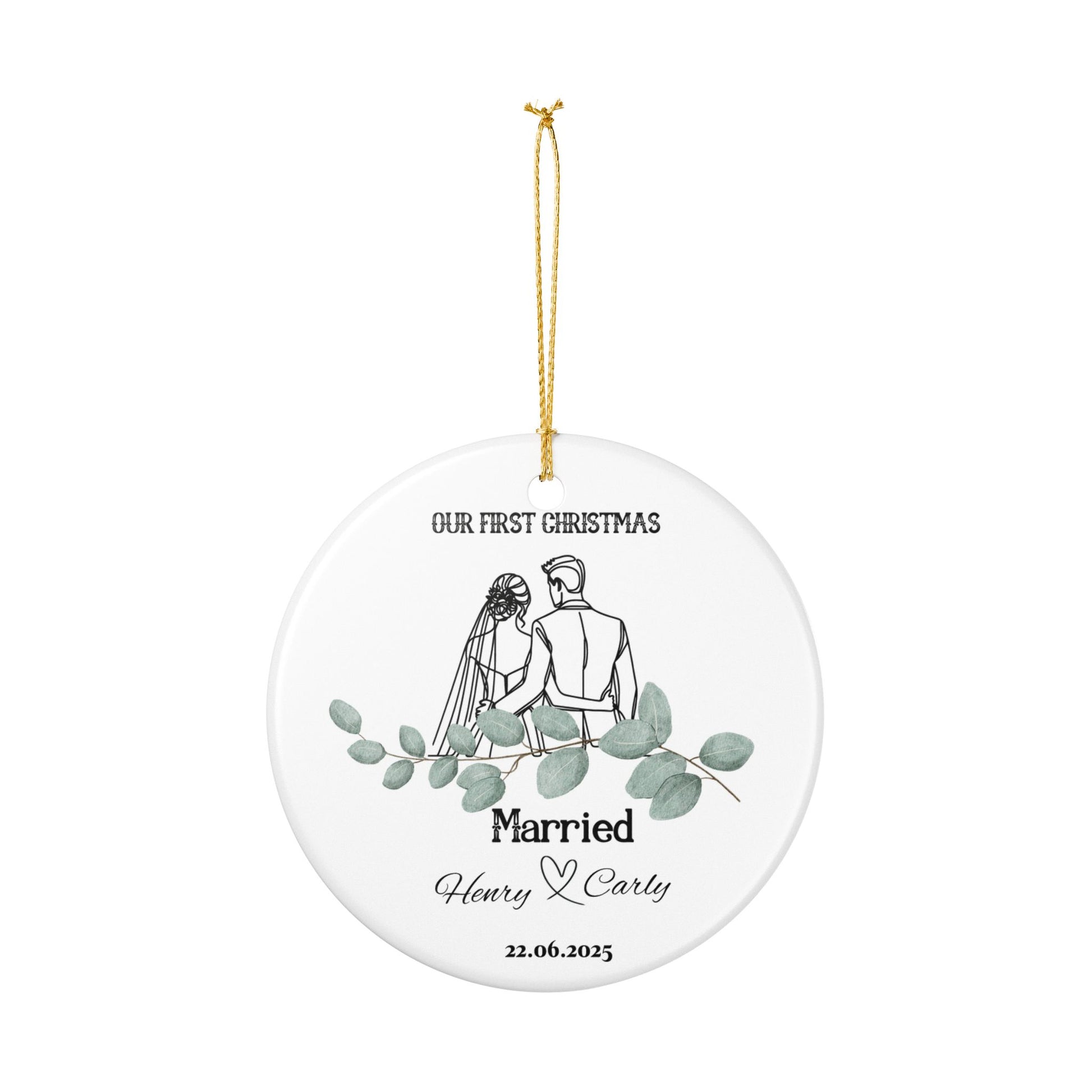 This exquisite ceramic ornament adds a touch of elegance to any holiday décor. Crafted from 100% white ceramic, it boasts a glossy finish that's both durable and stunning. Perfect for celebrating milestones, this ornament is ideal for newlyweds commemorating their first Christmas together, couples celebrating anniversaries, or as a unique decor piece for any occasion. Its gold string not only enhances its charm but also makes it easy to hang on the tree or display in your home. This ornament serves as a timeless keepsake that brings warmth and joy to your seasonal celebrations, making it a perfect gift for weddings, Christmas, or even housewarming events. It resonates beautifully with those who cherish personal touches in their holiday decor, reminding loved ones of special moments shared throughout the years.