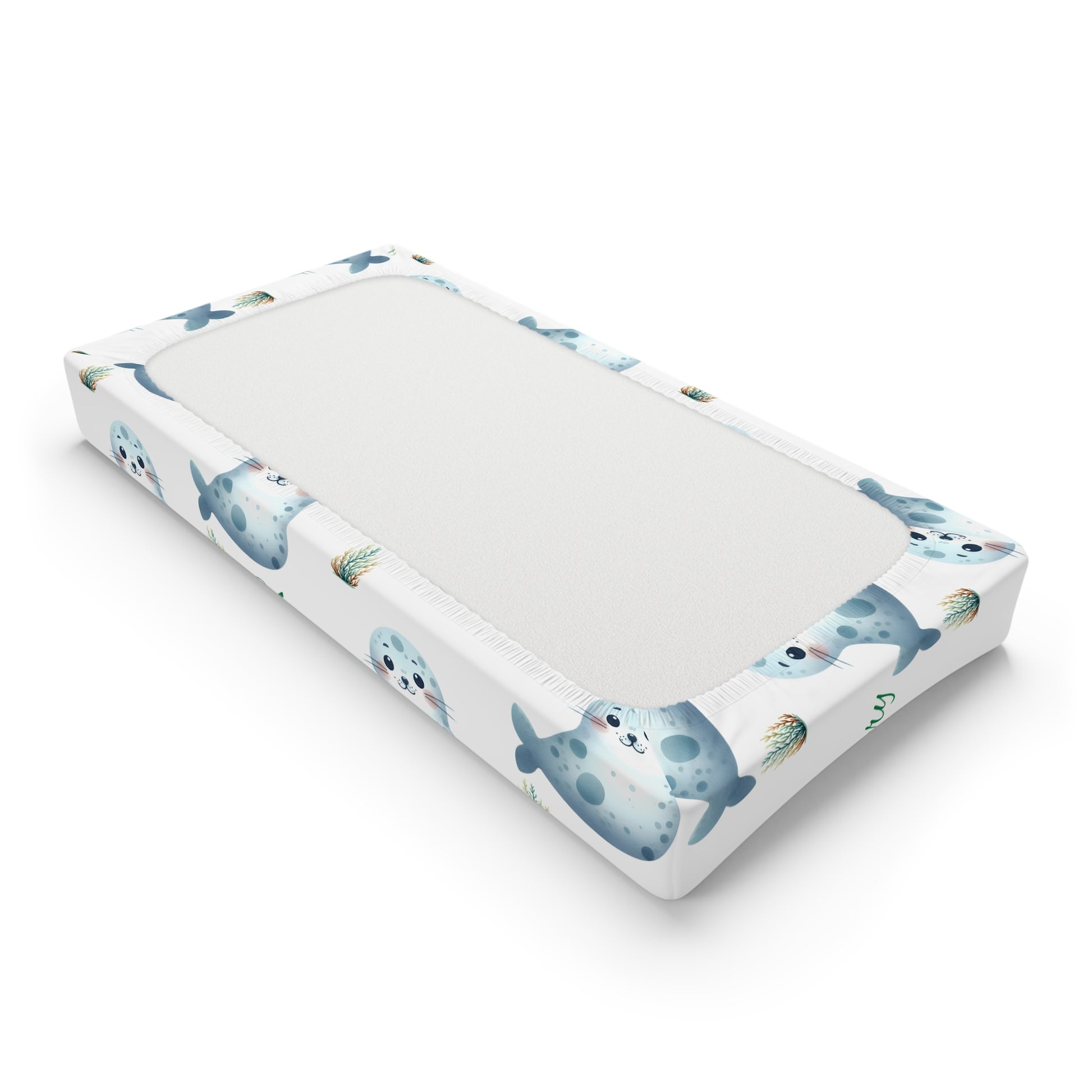 A soft, breathable changing pad cover adorned with hand-painted baby seal illustrations in soothing aqua tones. The stretchy jersey-knit fabric slips on easily and stays snug thanks to a reinforced elastic fitted lining, turning diaper changes into a calm, cozy moment. Lightweight and durable, the cover’s vibrant print holds up wash after wash while the smooth surface is gentle against delicate skin. It fits the standard 32" × 16.5" changing pad and brings a playful, ocean-inspired touch to nurseries or on-the-go care stations.