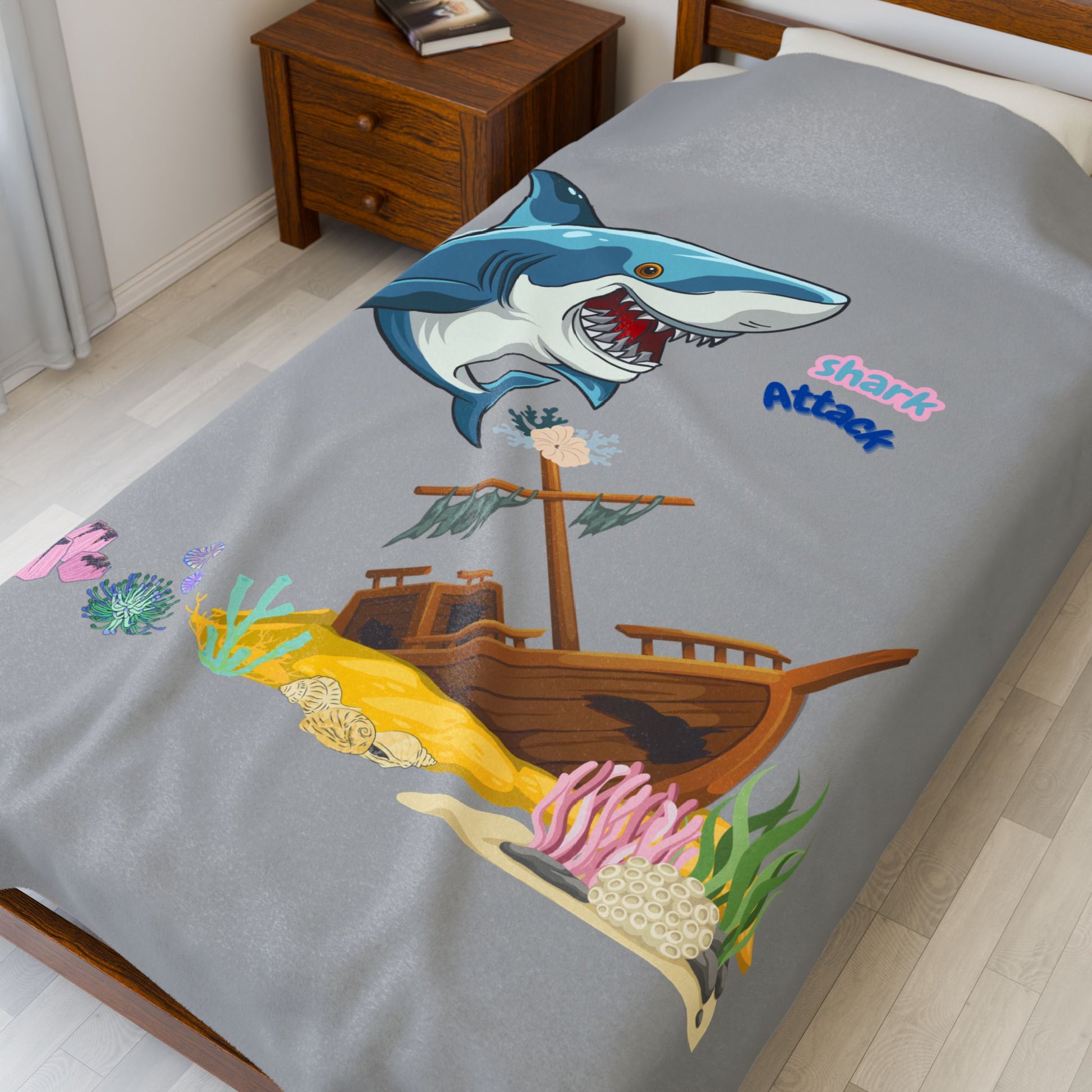 Shark ship colorful coral reef Velveteen Plush Blanket