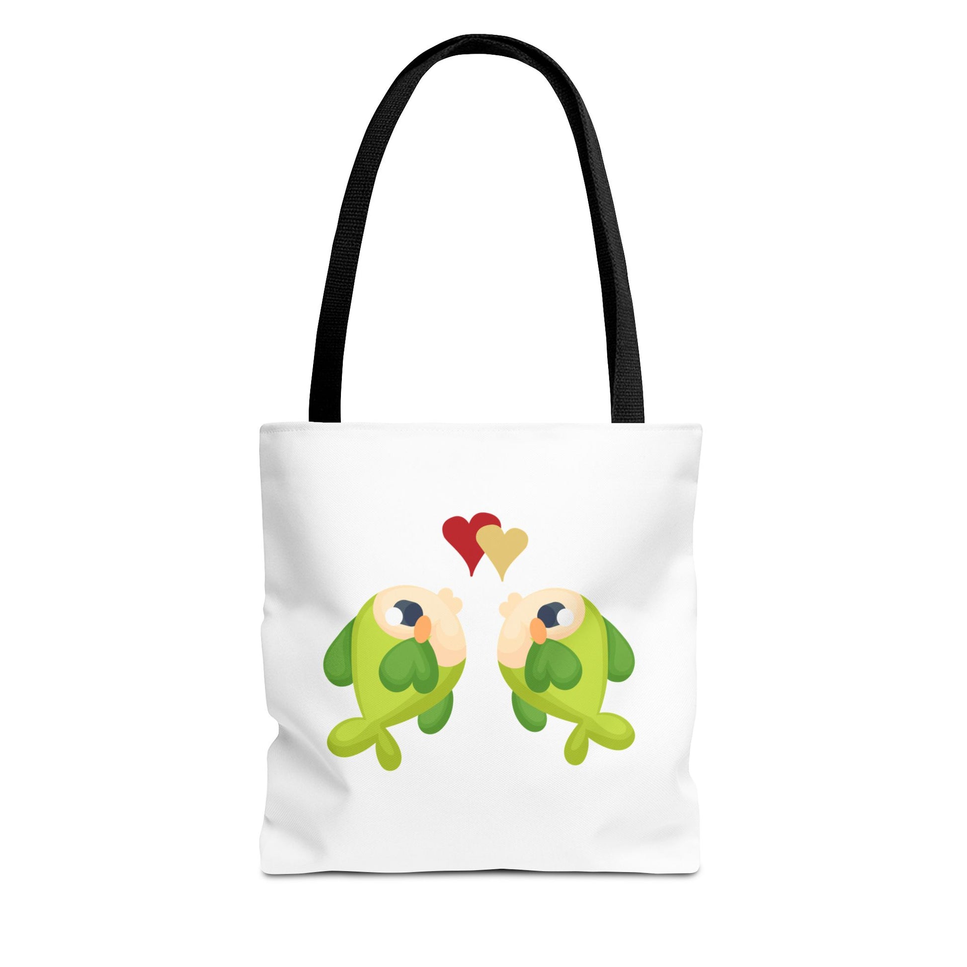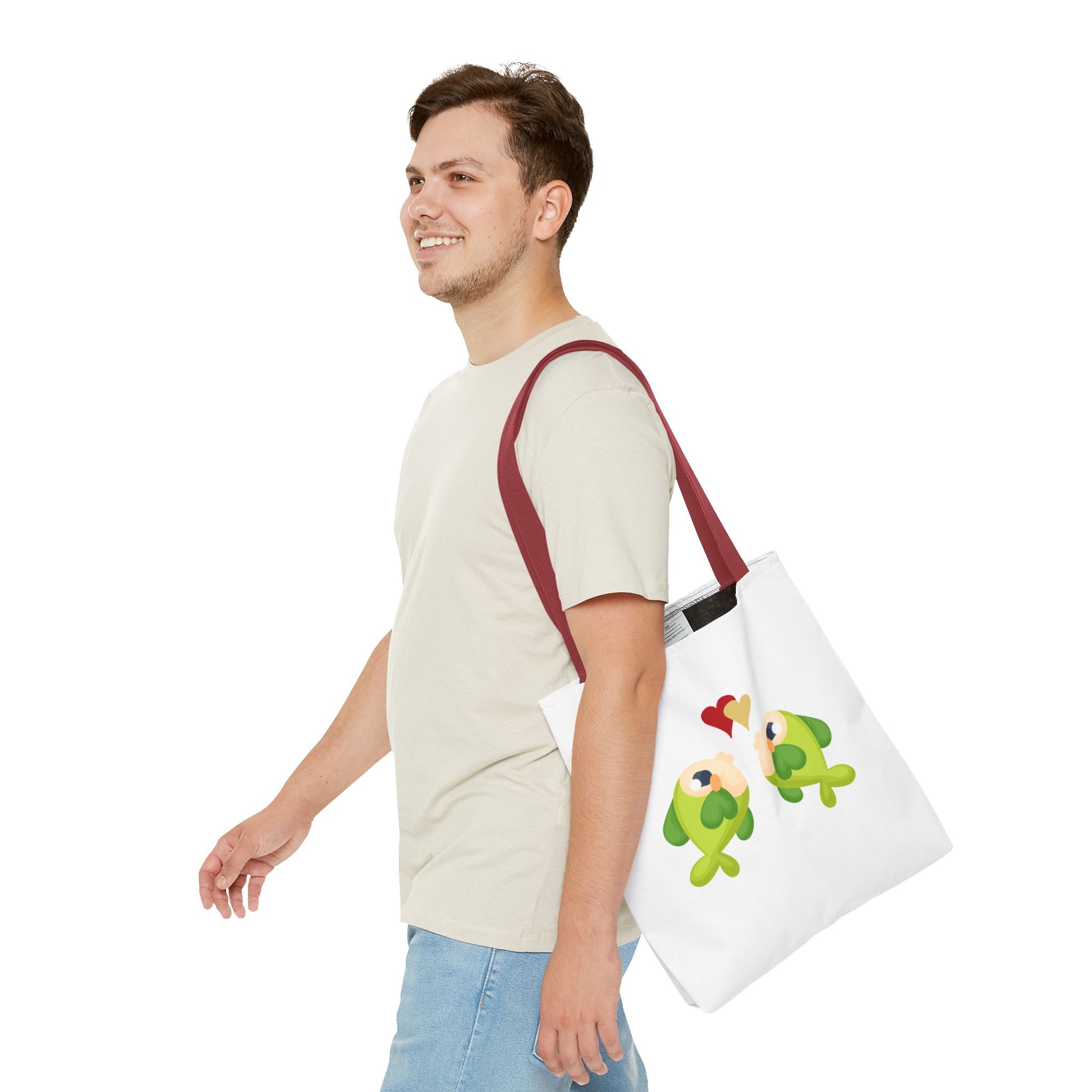 Two hearts float between the fish one red and one yellow. Tote Bag