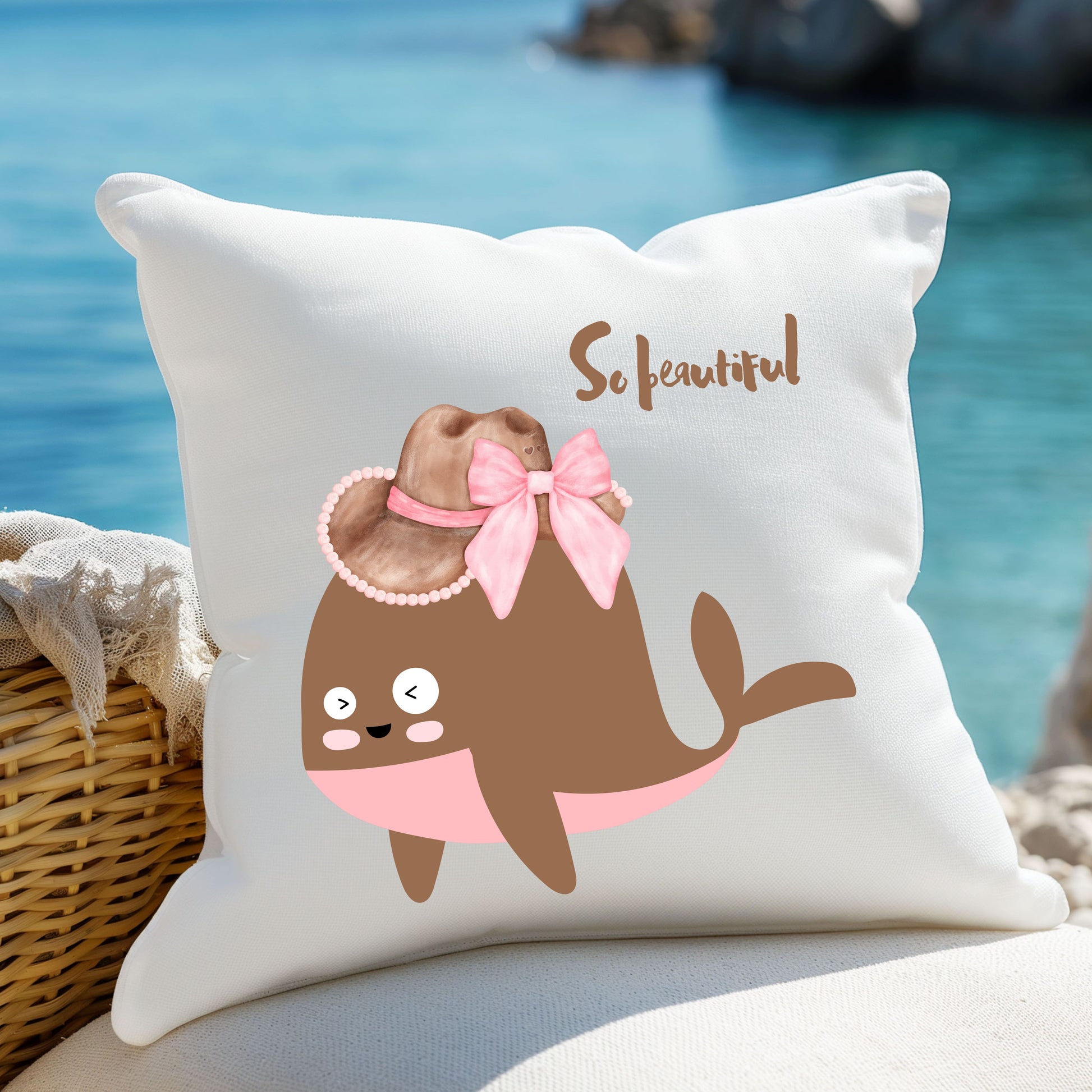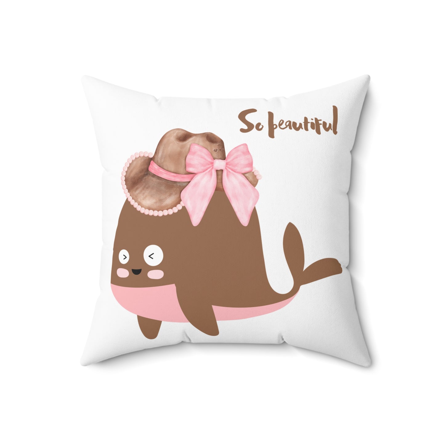 Whale wearing a cowboy hat with a pink bow Spun Polyester Square Pillow