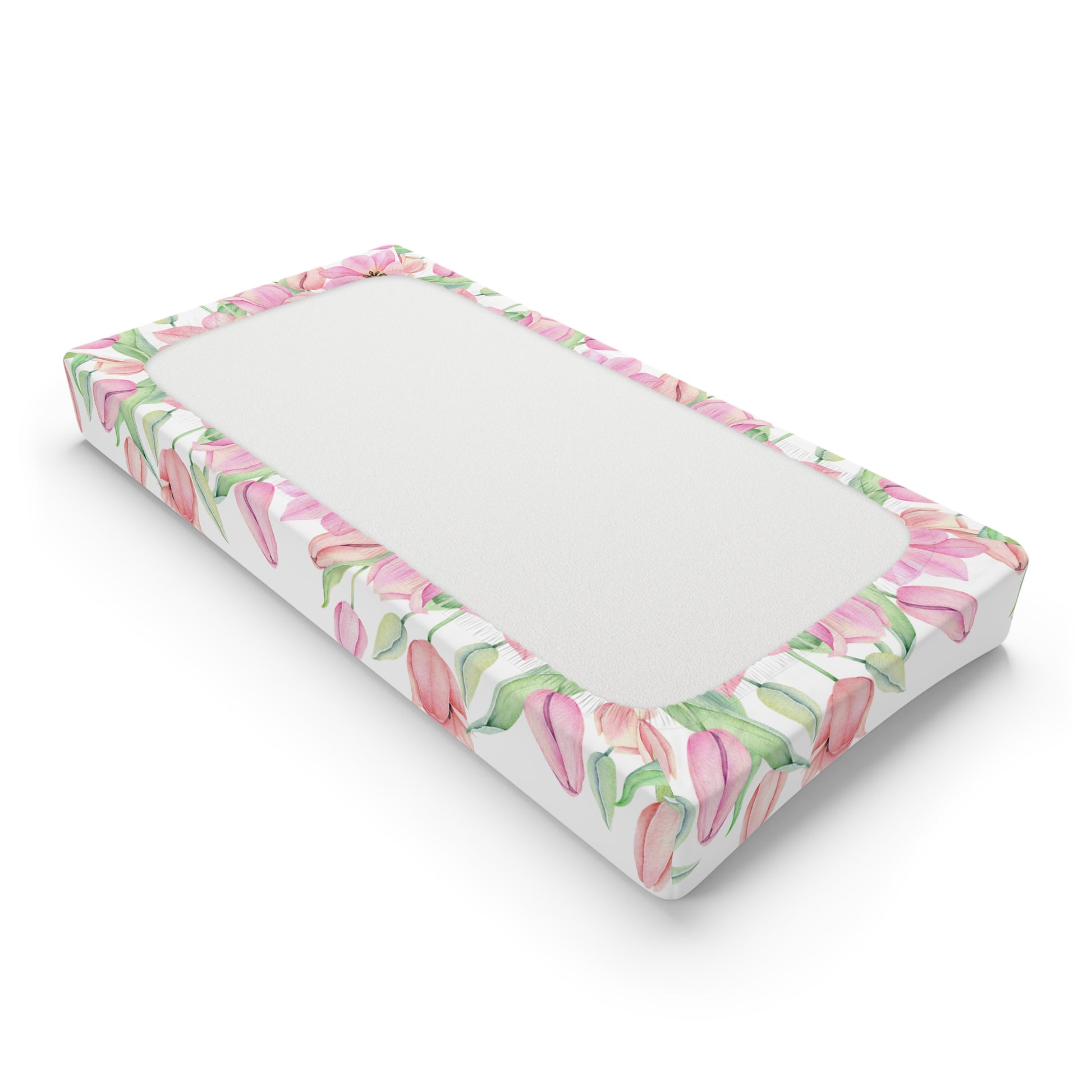 A soft, playful changing pad cover designed to bring a cheerful touch to diaper time. Cute watercolor-style zebras and gentle tulip borders create a calm, uplifting scene that turns routine changes into a sweet moment. The stretchy jersey knit hugs a standard 32" × 16.5" pad, while breathable, lightweight fabric keeps baby comfy. Hand-sewn construction and reinforced elastic ensure a snug fit that stays put through wiggles and quick clean-ups. This cover slips on easily and adds a cozy, nursery-ready look to any changing area.